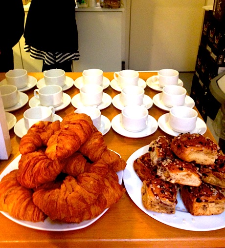 We had a buffet of croissants, chelsea buns, coffee and orange juice. Four lovely volunteers came at 6:30am to help us set up and serve the treats. For a while it was looking like we might be all to attend but suddenly at 6:45am, people starting filing through our door with eager eyes at the sight of coffee and pastries.