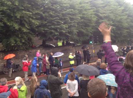 As the party bus approached, out everyone ran to cheer and began wildly screaming as the Torch ran past us. Some were in the street and some up on the church yard, which gave spectators great views of all the action. The rain wasn’t deterring anyone!