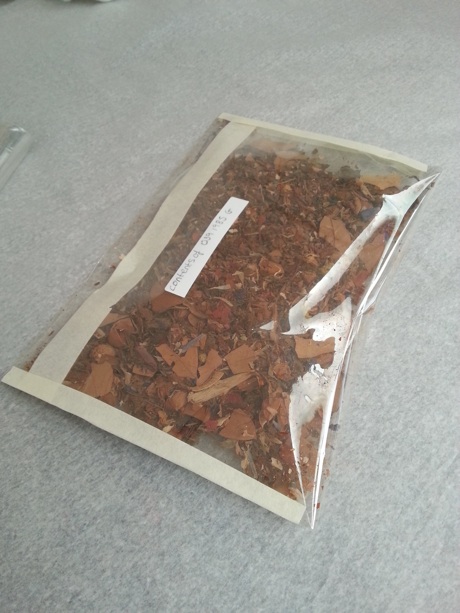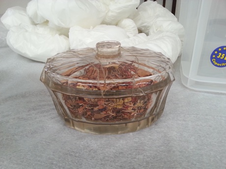 The original contents (potpourri) was decanted and labeled so it later can be easily reunited with the glass casket when it is reinstated back in the house.