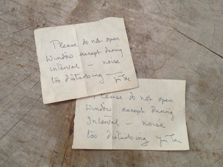 However on occasions, with the events and music at Kettle’s Yard, it was necessary for some kind of signage to be used – and below you can see some hand written ones by Jim himself. Ranging from signs directing people to not open windows during music concerts to the price of a replica of ‘Dog’ by Henri Gaurier-Brzeska (5 pence). These hand written signs were found when we emptied a section of the Kettle’s Yard house in preparation for essential maintenance work. Things like this are really wonderful to discover, giving a snapshot into Jim’s time at Kettle’s Yard and imagining why certain signs came to be… “Please leave candle above for me to take down – Jim Ede”.