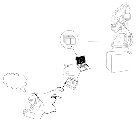 The neurophysiological responses and geometric information contained within the database and its interaction with Gustav’s brainwave data produced instructions for an industrial robot to create a sculpture. In effect, a solid block of stone has been rendered hollow as a consequence of an artist thinking about nothing. Because of a paradoxical humour that runs through the work this sounds like a technologically enabled magic trick, drawing on the scientific study of illusions that suggests the brain generates what it perceives, unless we make strong efforts to the contrary. We are in fact making reference to the New Scientist, September 2000 which announced the immanent arrival of 3d printing on its front cover with the line: Imagine an Object and it will appear. We had been working with digital biomonitors and software for some time when we saw the possibility of hooking these digital devices up and literally bringing an object into existence through some kind of brainwave analysis. Mindful of the neurobiologist, William Calvin’s recognition that the science and technology of mind may move far more quickly then we can create consensus for; creating another level of stratification between “The Enhanced and The Rest”, we became interested in the ethics around this kind of augmentation. As a projection of a technological future, the work demonstrates ambivalence, sitting between a kind of techno optimism, and a post-human nightmare. It could go either way.